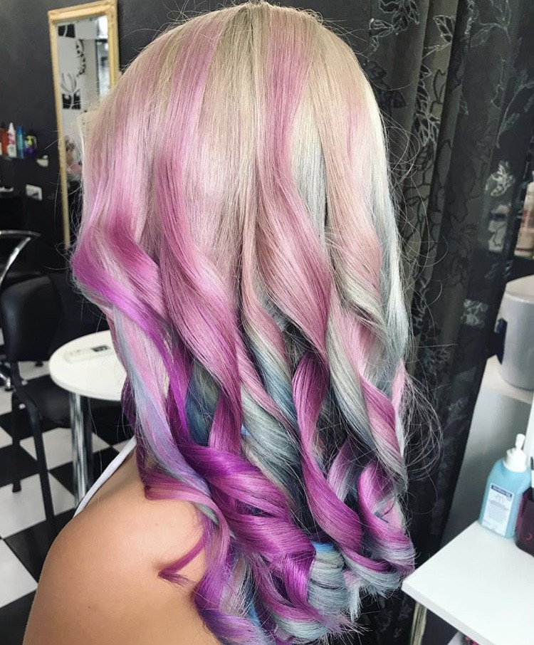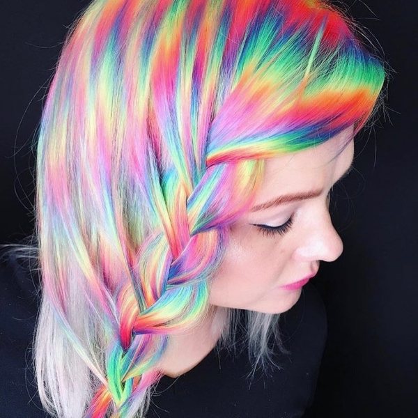 Исходя из названия, понятно, что радужное имитирует радугу на голове. Наиболее яркий и традиционный. Однако, риски выполнить неправильно — велики. Предварительно всю длину нужно обесцветить в холодный блонд. Но, недостаток — вернуть длину в натуральный цвет сложно.